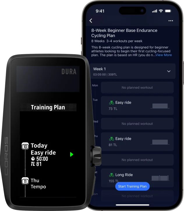 Improve your performance with free cycling training plans that sync directly to the COROS app and your COROS DURA.